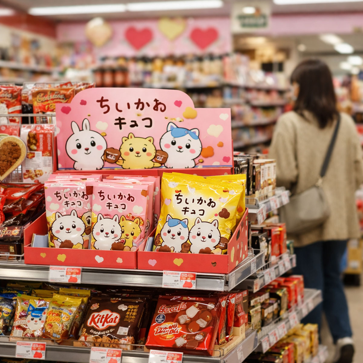 イオン・西友・イトーヨーカドーなどでは、お菓子売り場が広いため、ちいかわチョコも通常のチョコ棚・キャラクター菓子棚・季節イベント棚に分かれて置かれることがあります。